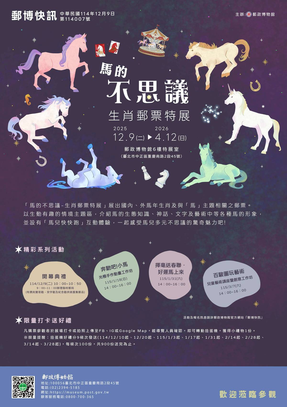 王董事長特別指出,明(115)年是中華郵政公司130歲生日,郵政博物館也將邁入60週年。郵政博物館過去60年來扮演郵政文化展示與推廣的重要角色,隨著臺北館、高雄館及臺中館相繼成立,串聯臺灣北、中、南三區郵政展示交流空間,不定時推出特展,讓民眾得以多方欣賞郵票之美,發揚郵政文化。適逢馬年,此次馬年生肖展特別有紀念與共同慶祝意義。期待中華郵政公司與郵政博物館「馬到成功」、業績「一馬當先」,並祝福大家新的一年「駿馬奔來報喜訊,馬到平安福滿門」。