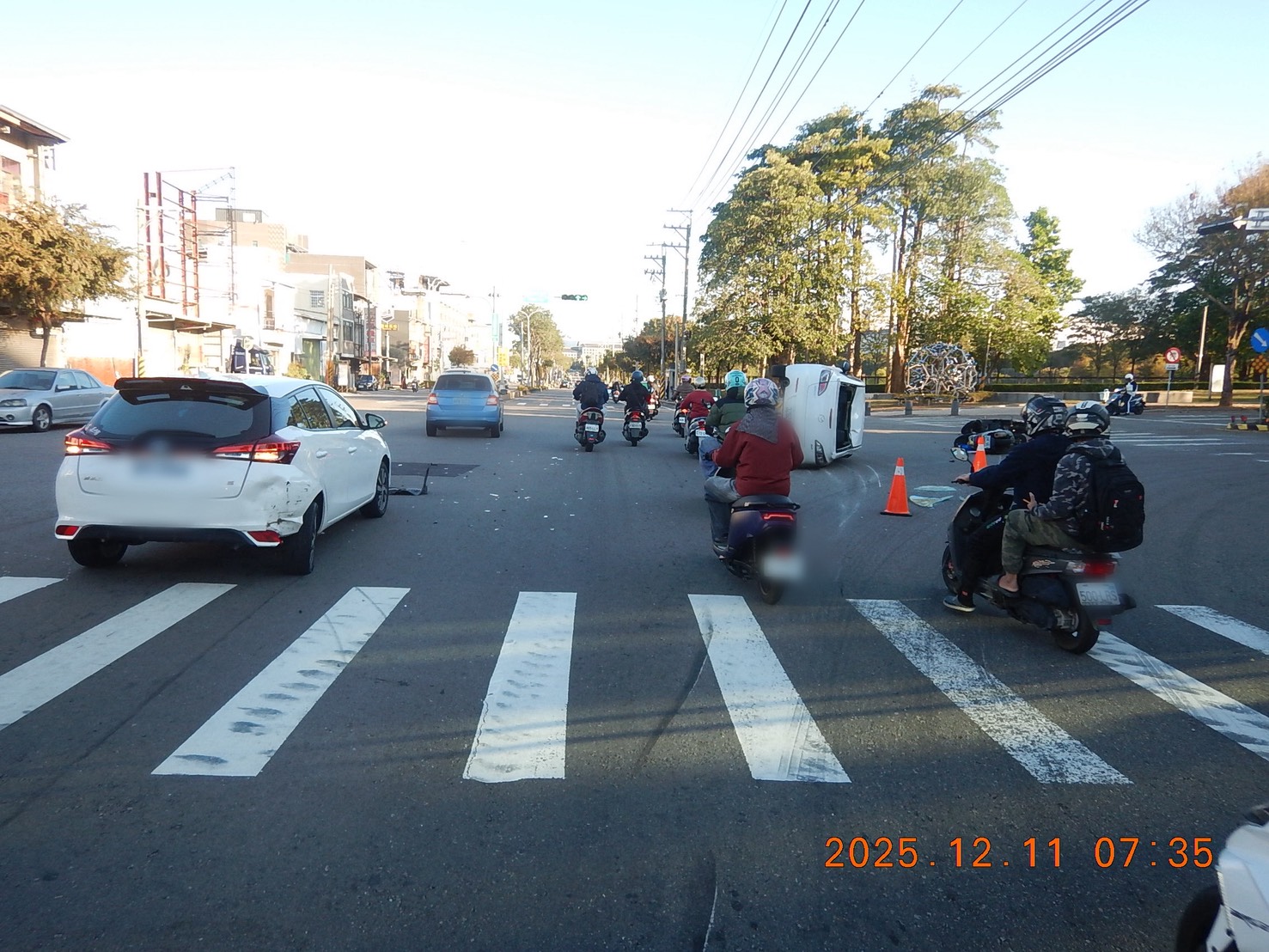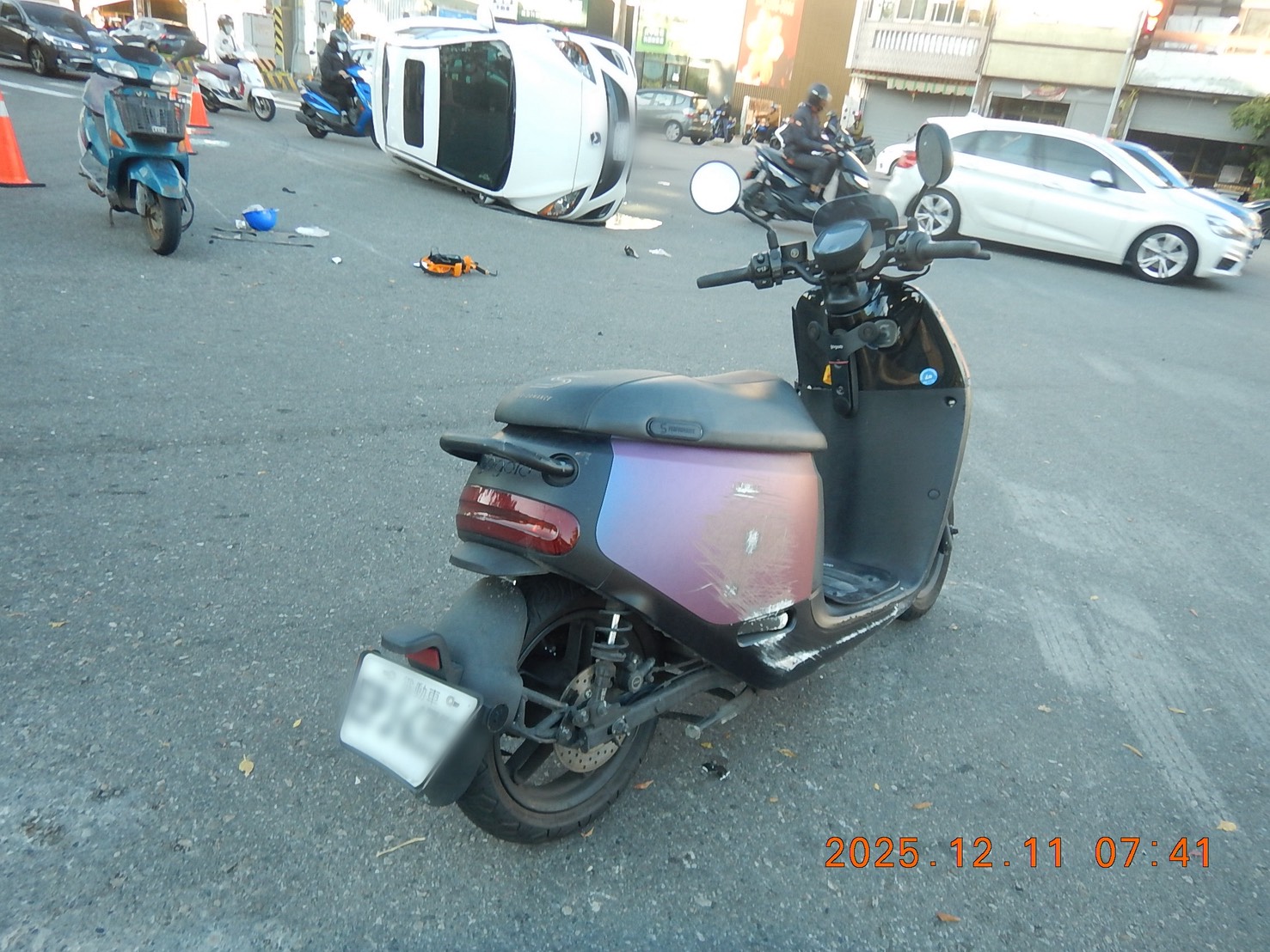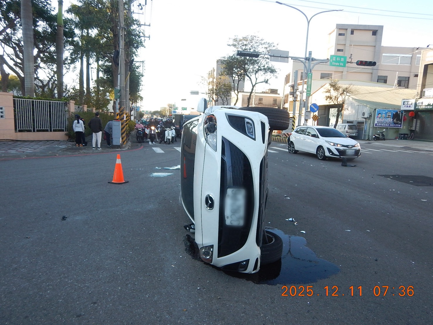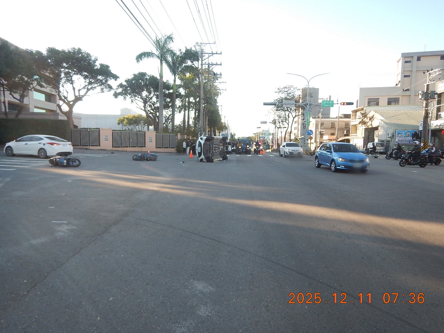 事故還沒結束——翁男的車因撞擊失控向右翻覆,翻倒後再波及同向慢車道的2輛機車,分別由41歲謝姓男子與64歲李姓女子騎乘,現場一度相當混亂,所幸無人酒駕。