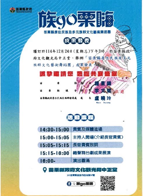 苗栗縣原住民族及多元族群文化藝術舞蹈團年度成果展《族go栗聽》,將於 114年12月24日(星期二)下午3時在苗栗縣政府文化觀光局中正堂登場。活動自 12月16日起於縣府三辦開放免費索票,歡迎民眾踴躍索取。