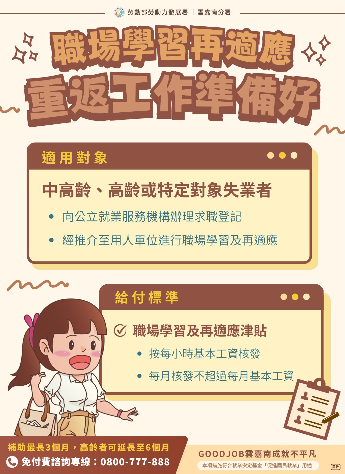 ▲勞動部「職場學習及再適應計畫」補助雇主進用特定失業者的職場學習及再適應津貼及行管輔導費,補助最長3個月。(圖/雲嘉南分署提供)