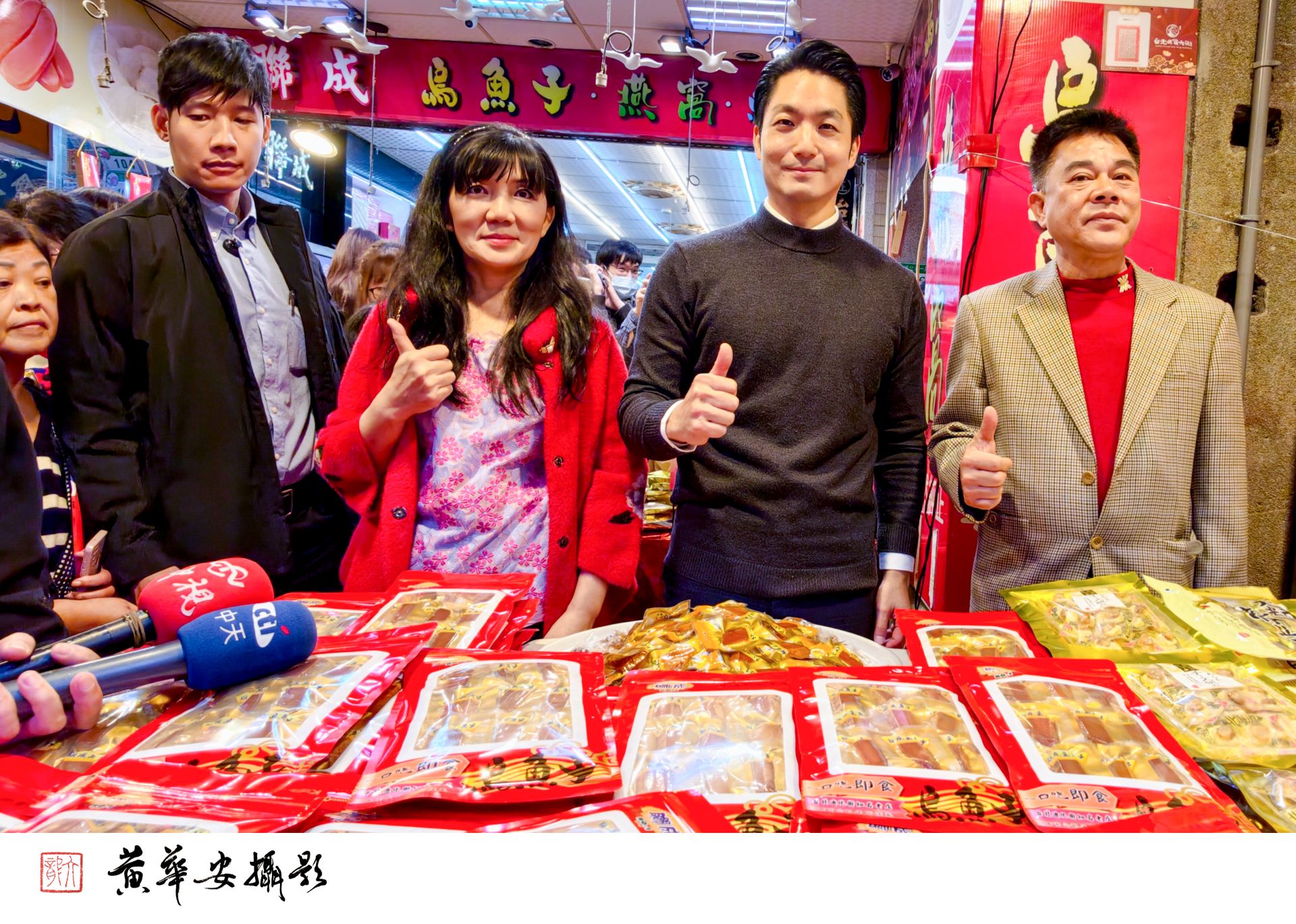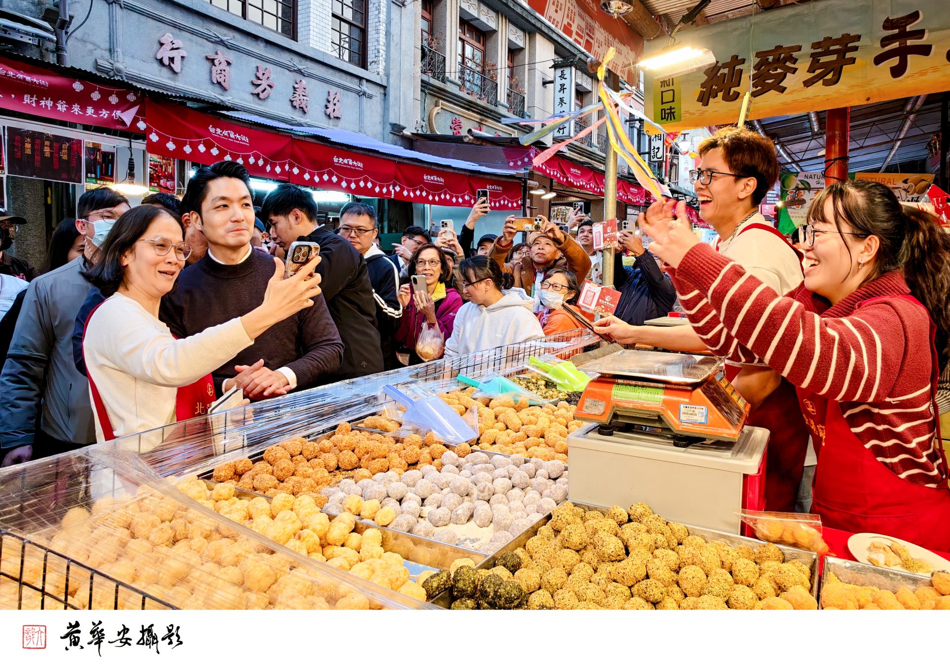 市長蔣萬安走訪迪化街年貨大街,親切與店家合影現場氣氛熱絡喜氣。(圖/記者黃華安攝)