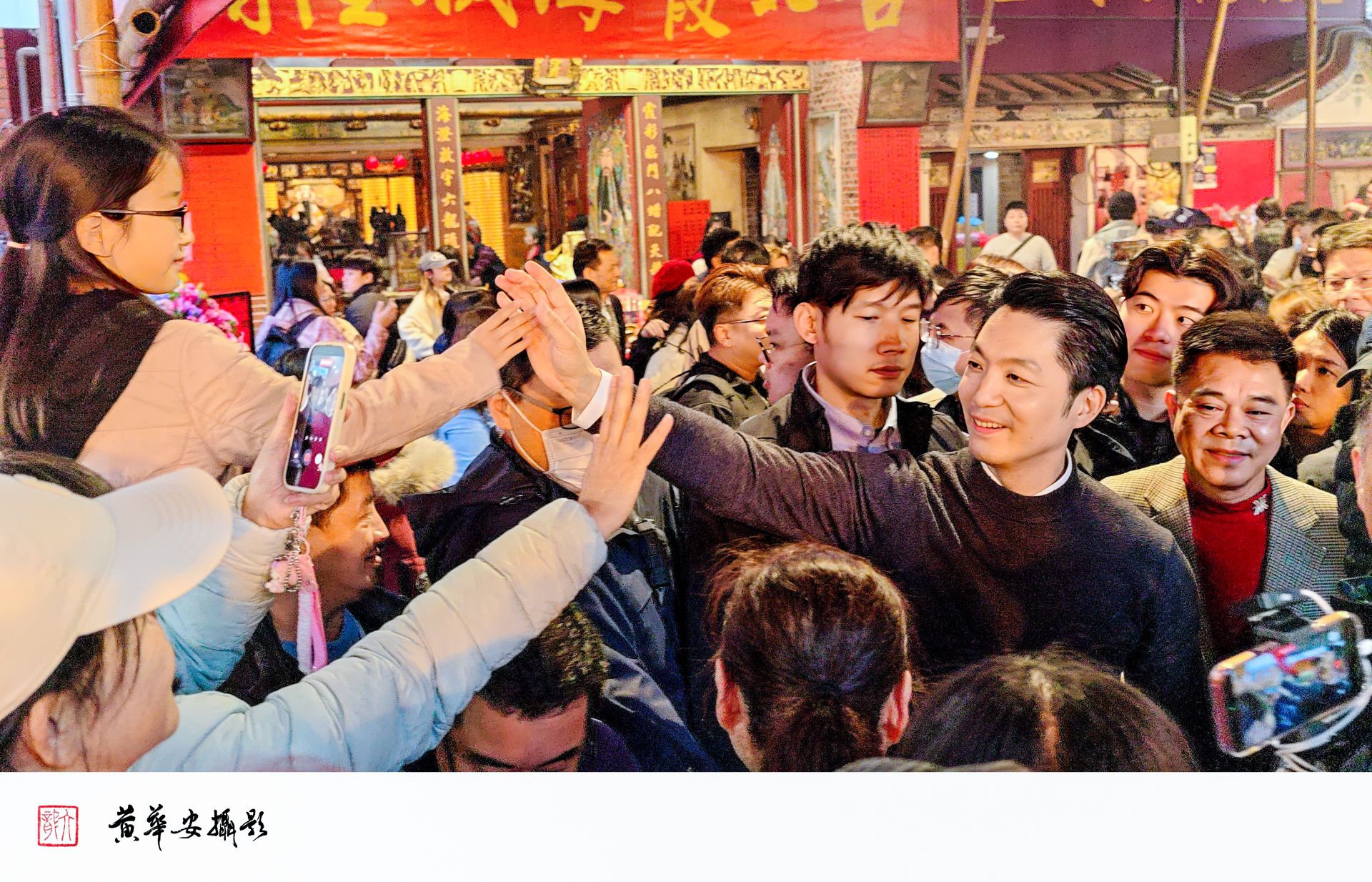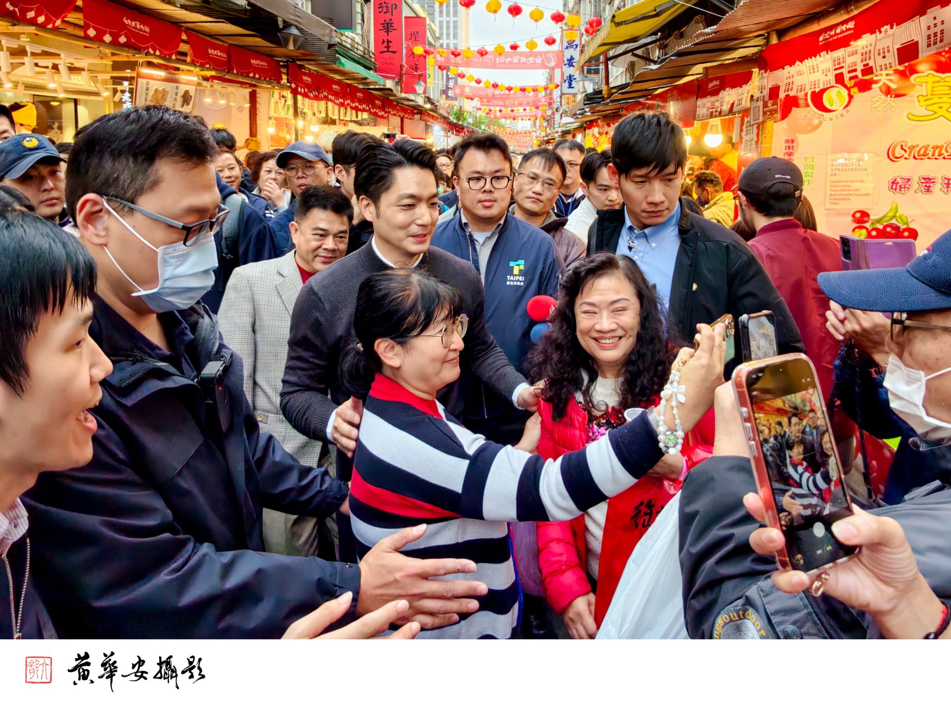 市長蔣萬安走訪迪化街年貨大街,沿途與商家、市民互動熱絡,店家爭相合影簽名留念。(圖/記者黃華安攝)