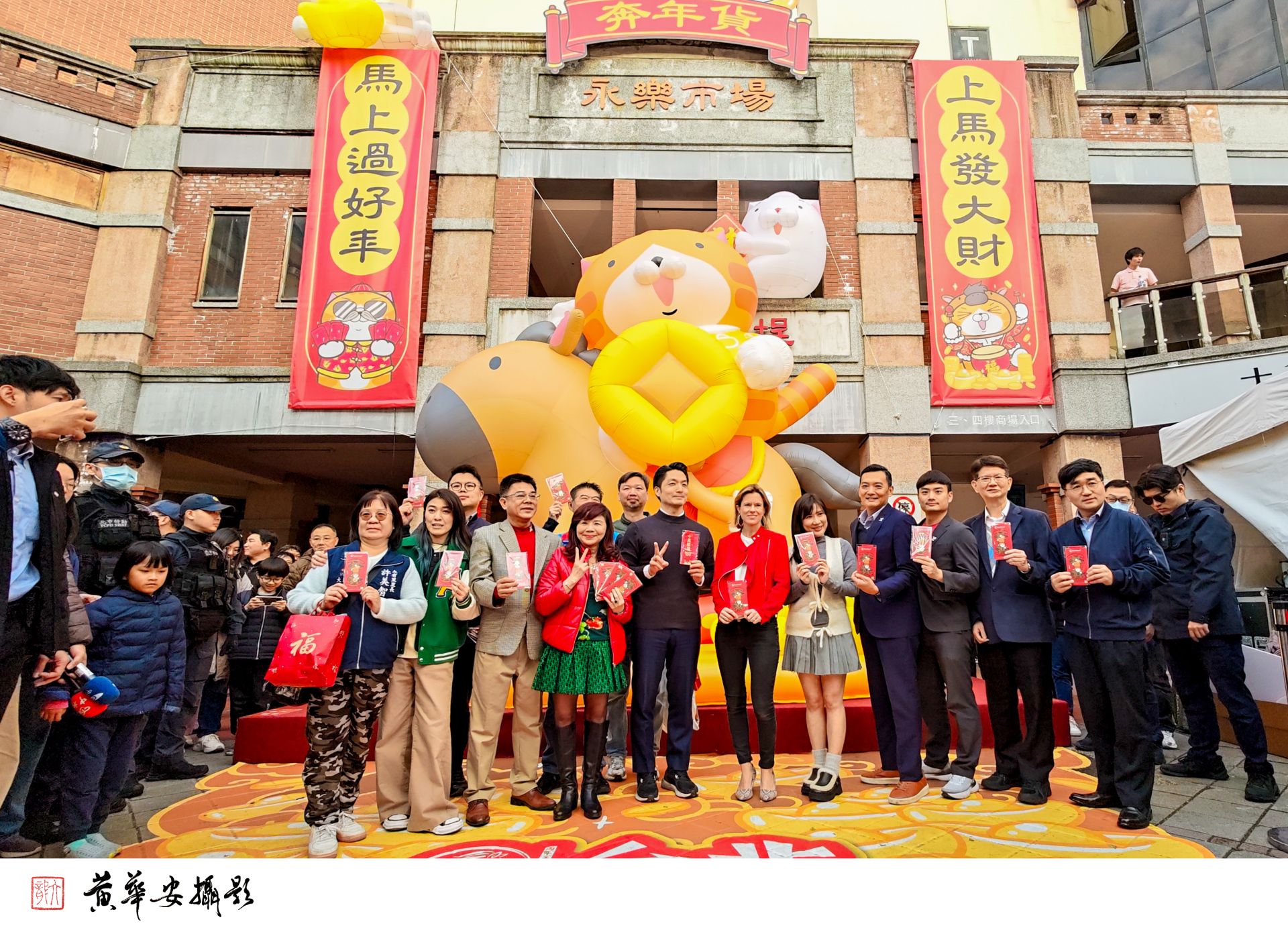 奔年貨,「上馬發大財、馬上過好年」,蔣萬安與與會貴賓在永樂市場前合影宣傳,迎接熱鬧新春。(圖/記者黃華安攝)