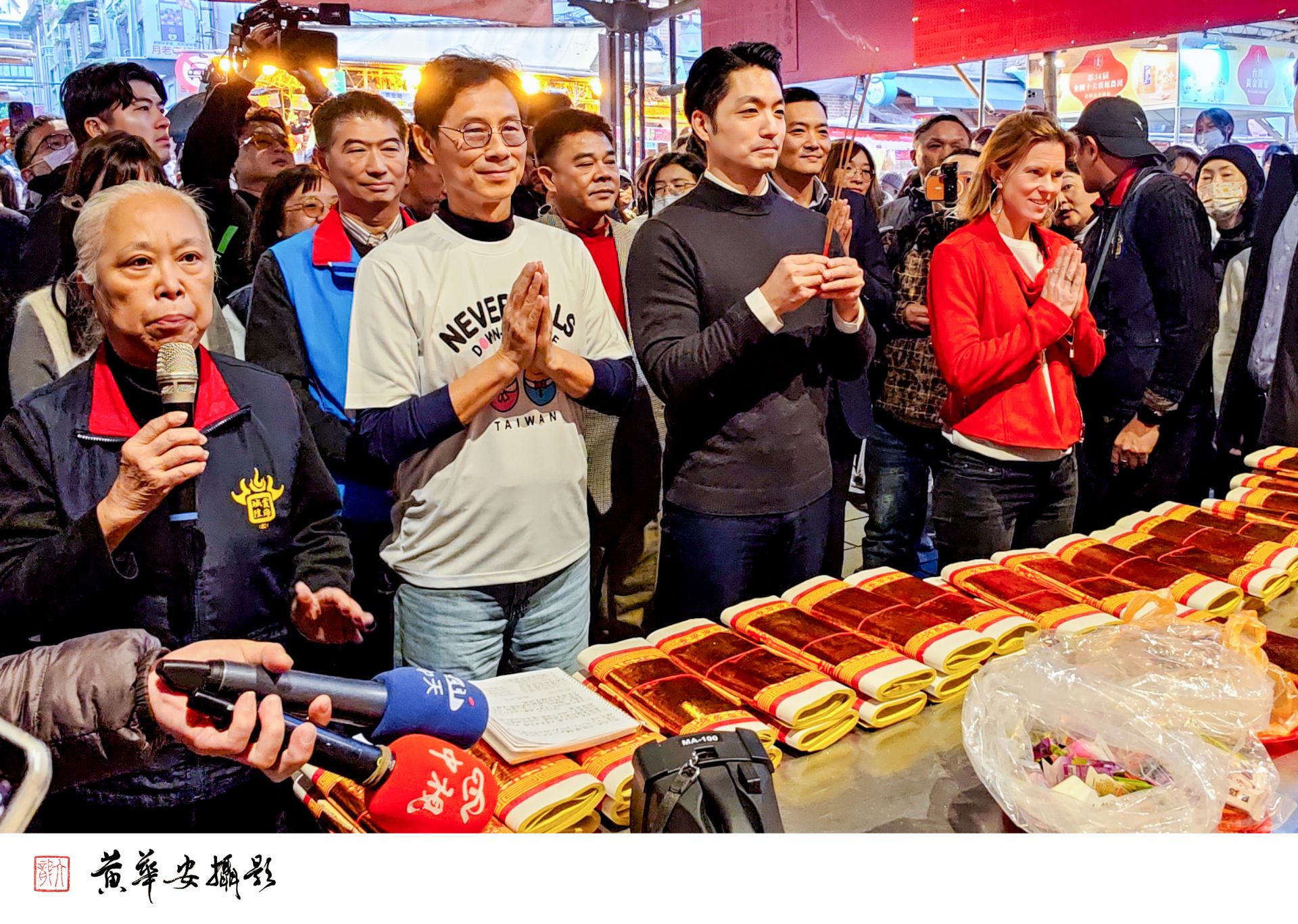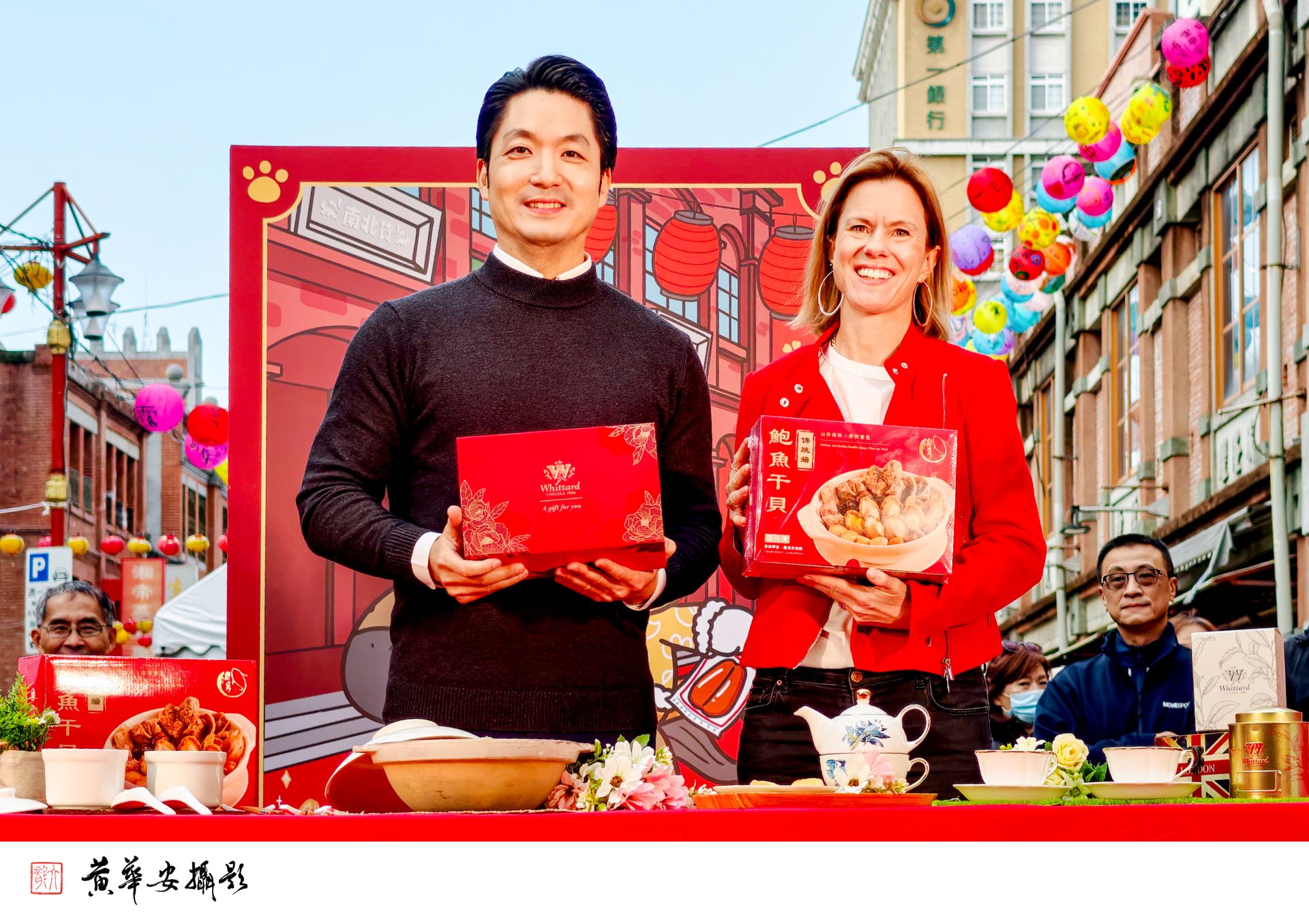 台北市長蔣萬安化身「迪化街年貨大街代言人」,攜手英國在台辦事處代表包瓊郁(Ruth Bradley-Jones,中)提前向市民拜年,邀請國內外旅客走進迪化街,感受臺北最有年味的一條街。(圖/記者黃華安攝)