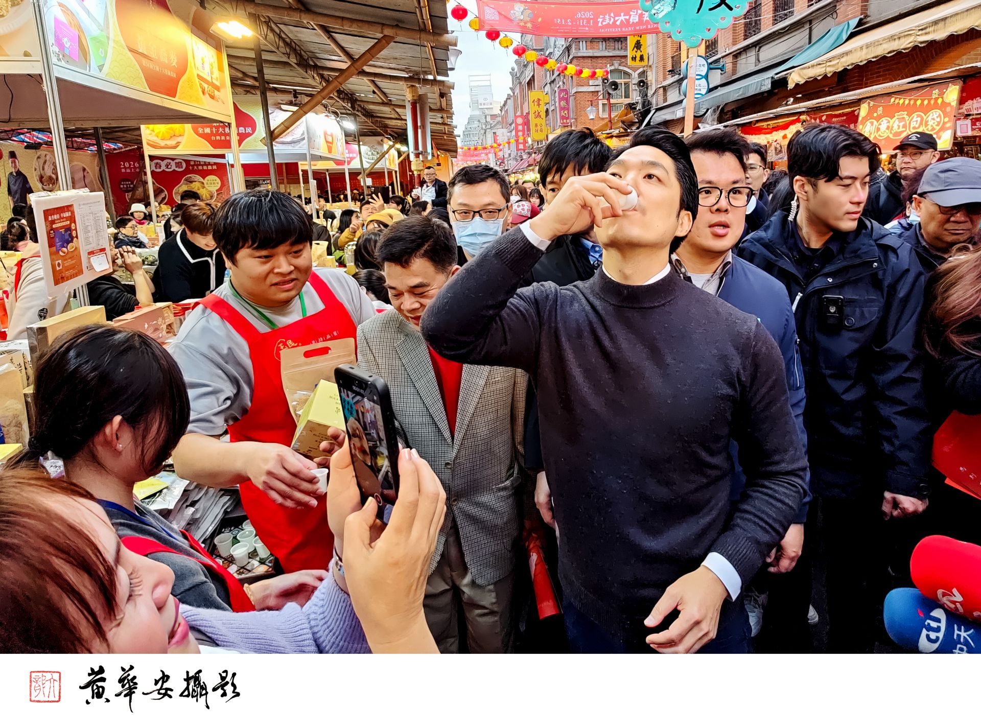 市長蔣萬安走訪迪化街年貨大街,與民眾一同試吃及試喝,近距離感受傳統市集的人情味與年節香氣。(圖/記者黃華安攝)