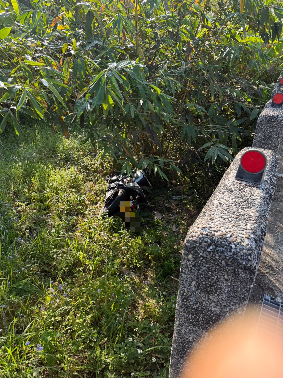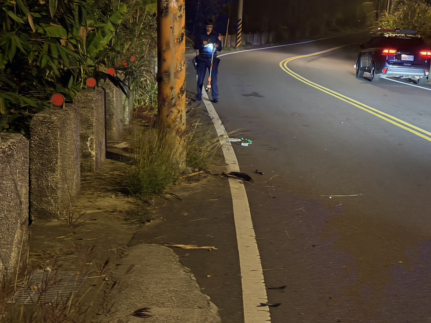 嘉義梅山男子騎機車自撞電桿掉落路旁邊坡死亡,警方到場勘驗調查。翻攝畫面