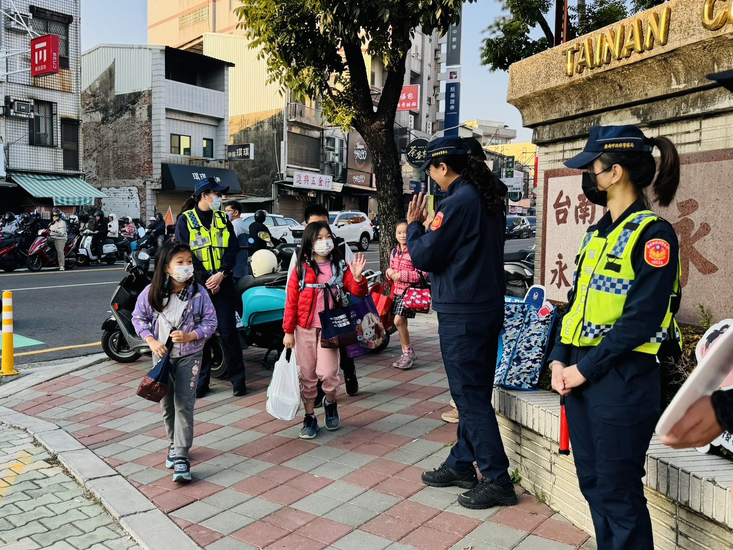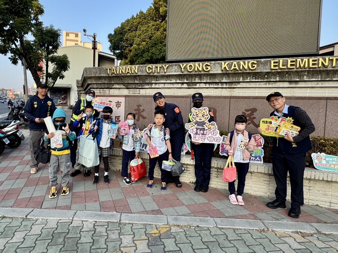 臺南市政府警察局婦幼警察隊隊長陳佩鈴一早親自率員前往臺南市永康區永康國小護童,並藉由發送實用文具宣導品,以傳達「兒少保護」、「反毒」、「反詐騙」及「交通安全」等重要防護觀念。